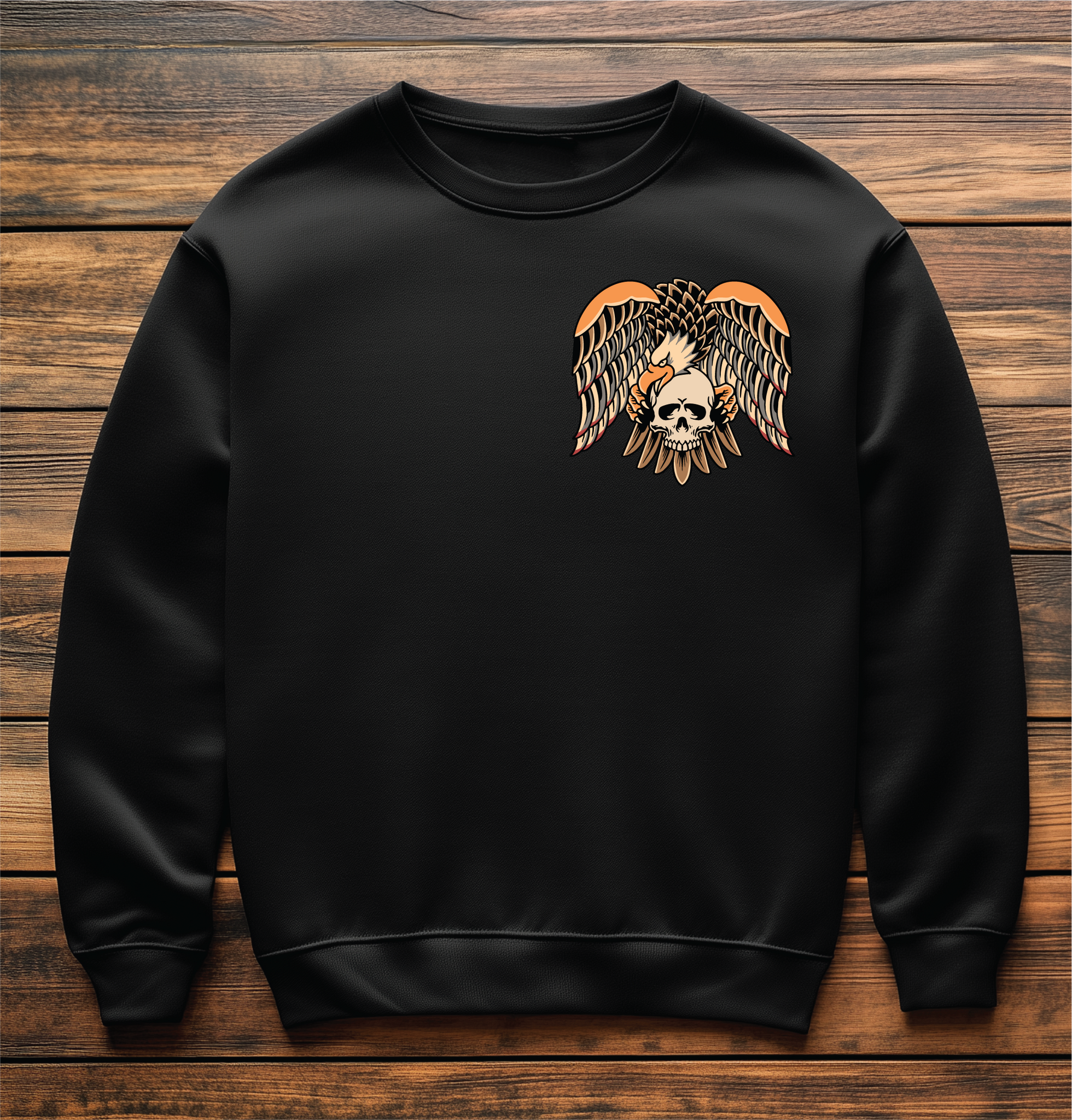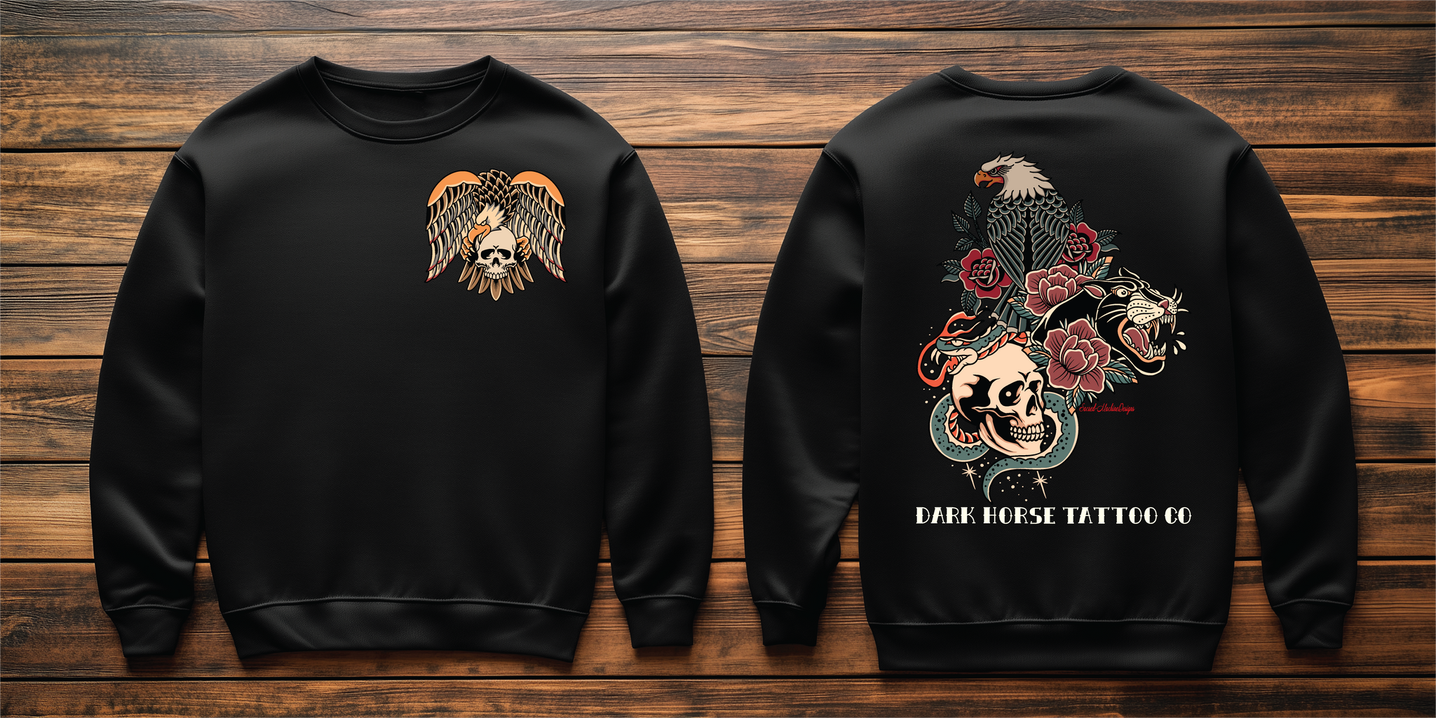 Sacred-Machine Designs, Dark Horse Tattoo Eagle Crewneck Sweatshirt Spread your wings with this killer crewneck sweatshirt featuring a bold dark horse tattoo eagle design that demands attention. This isn't your average everyday sweatshirt—it's a conversation starter wrapped in comfort. The intricate eagle artwork channels classic tattoo vibes, perfect for anyone who loves edgy style without the needle commitment. Whether you're channeling your inner rebel or just appreciate seriously cool graphic design, this piece delivers personality in spades. Throw it on and let your fashion do the talking.